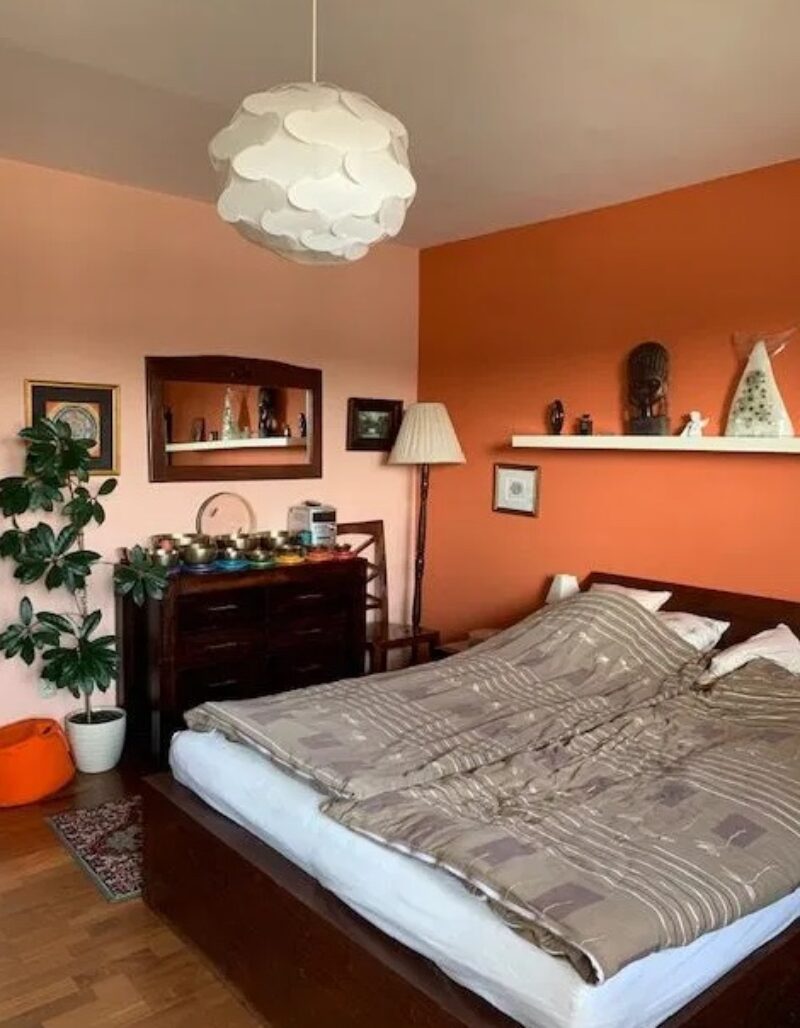 W mieszkaniu dokonano drobnej zmiany, którą bez problemu można odwrócić połączono kuchnię z pokojem, który był sypialnią a w dużym dawniej pokoju urządzono sypialnię z wyjściem na balkon.